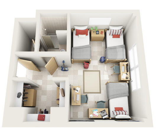 Students will have a dorm room on campus. The room provides three beds, one bath, and three sections for clothing. Students are allowed to rearrange their room but please refer back to the Rules to see what is accepted for decorating.